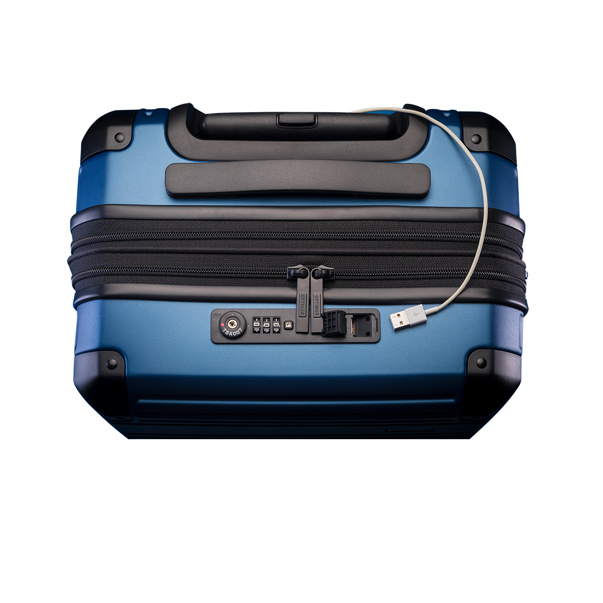 Once you have your own battery pack, open your carry-on and locate the pocket found in the top of the front panel. From there, plug the USB cord that comes with the suitcase into your battery pack, then place the battery pack into the pocket and seal it closed. Next, close your luggage and bring it upright. On the same panel as your lock, you’ll notice a small black rubber cover. Lift the cover; now you can plug in any electronic device that is powered by a USB cord into your luggage without being restricted to a wall outlet.